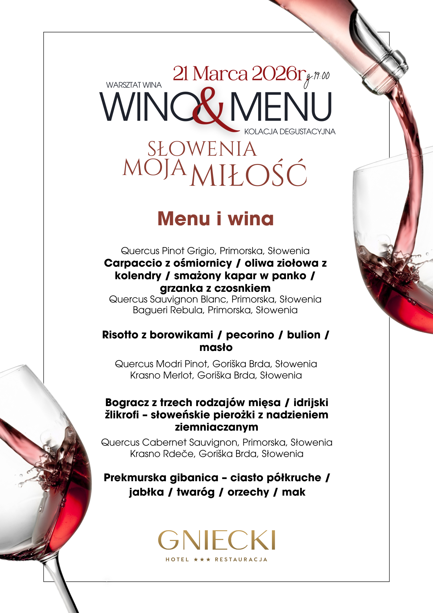 W programie wydarzenia przewidziana jest starannie skomponowana kolacja degustacyjna, oparta na sezonowym menu, w którym każde danie zostało dopasowane do wybranego wina. Degustacja będzie prowadzona w formie komentowanej prezentacji, podczas której uczestnicy poznają specyfikę regionów winiarskich Słowenii, charakter lokalnych odmian oraz filozofię tamtejszych producentów.